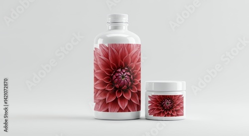 Dahlia Pinnata Flower Close Up on White Product Bottles For Brand Promotion and Derivative Mockup Display Against Neutral Background
