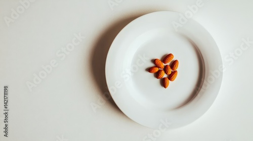 Fototapeta - A handful of chocolate-covered almonds placed on a clean white plate with plenty of space surrounding them for marketing or design