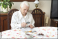 Fototapeta - Staruszka siedzi przy stole z gazetą. Babcia czyta gazetę trzymając szkło powiększające.