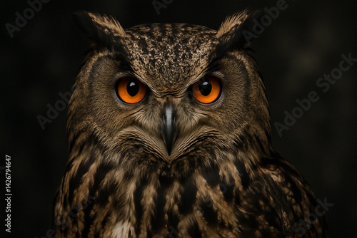 Fototapeta - Retrato realista de uma coruja com olhos laranja intensos em fundo escuro