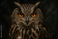 Retrato realista de uma coruja com olhos laranja intensos em fundo escuro