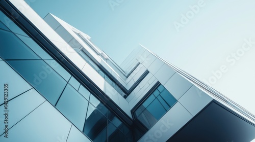 Fototapeta - A tall building with a lot of windows and a blue sky in the background