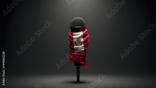 Fototapeta - A powerful metaphor for silenced voices: the Peru flag tightly binds a microphone, representing censorship. Dark, moody lighting enhances the tension. Minimalist yet deeply symbolic.