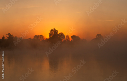 Fototapeta - Wiosenny, mglisty poranek nad stawem, wschód słońca, tapeta, dekoracja.