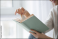 Fototapeta - Beautiful young woman reading book near window at home, closeup