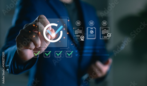 >Plakat>A businessman interacting with digital checkmarks and ISO document icons, representing quality control, standard certification workflow, compliance process, and international audit readiness.