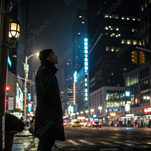 >Plakat>Under the city lights, a man reflects joyfully echoes through the streets, finding meaning in the night's embrace in a bustling urban landscape