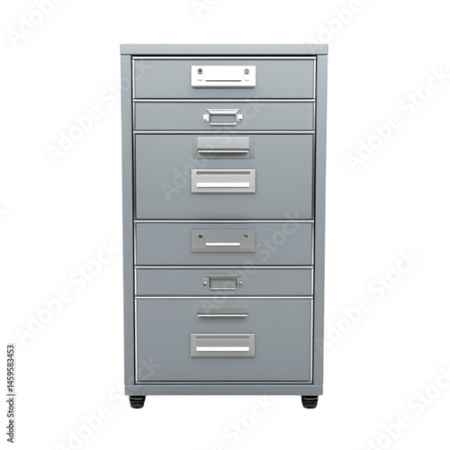 realistic product filing cabinet with three-drawer steel cabinet in light grey isolated on pure white background subtle soft shadow clean studio lighting, ultra-high detail, PNG stock render :