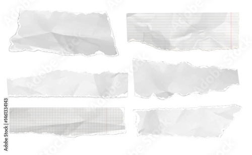 >Plakat>Ripped paper strips. Realistic crumpled paper scraps, white torn notebook sheets with shadow. Ripped papers with crumpled grange texture. Scrapbook banners vector set.