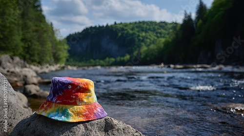 Fototapeta - Bucket hat with tie-dye design placed on a rock during a river-side adventure
