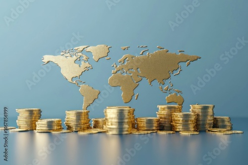 Fototapeta - Gold coins stacked beneath a world map. Global finance concept