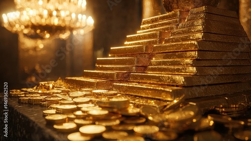 Golden Riches: Stack of Gold Bars and Coins Representing Wealth and Finance gold stack wealth golden