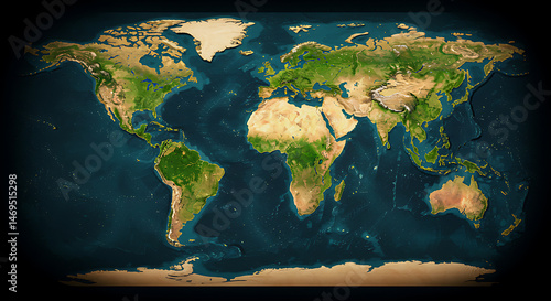 >Plakat>Detailed world map featuring continents, oceans, and geographical features in vibrant colors, creating a global view for educational and design purposes