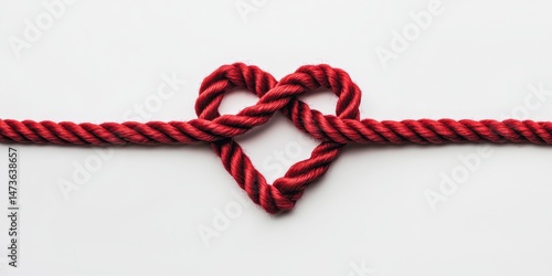 A red rope is tied in a knot to form a heart shape. The heart is made of rope and is red in color