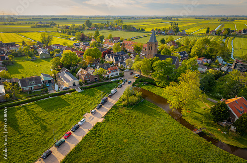 Aerial view of Zunderdorp on a sunny spring afternoon, idyllic dutch village in Province North Holland