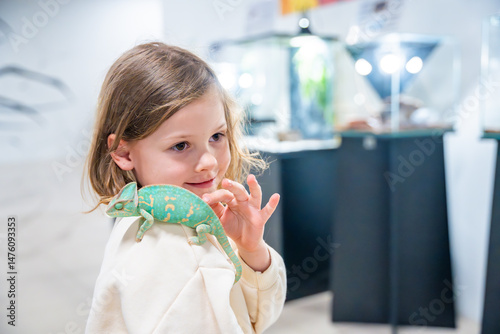 Fototapeta - Little girl holding a green chameleon in her hands. Concept of childhood curiosity, interaction with exotic animals, and early interest in biology