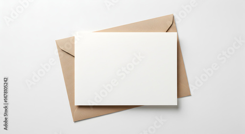 Fototapeta - A blank white card resting on a brown kraft envelope against a plain white background surface view