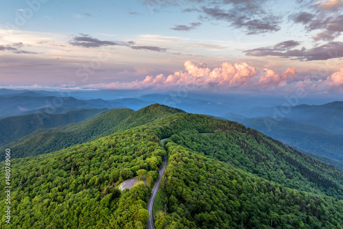 Fototapeta - Car road trip on Blue Ridge Parkway in North Carolina Appalachian mountains. Observation Mount Mitchell Overlook parking in summer season. Summertime landscape of beautiful nature