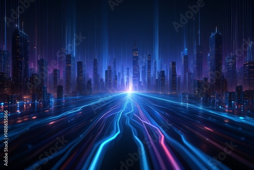 Fototapeta - Futuristic cityscape representing data transmission and technological advancement