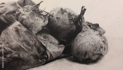 Fototapeta - Monochromatyczny rysunek węglem, martwa natura z pomarszczonymi przedmiotami