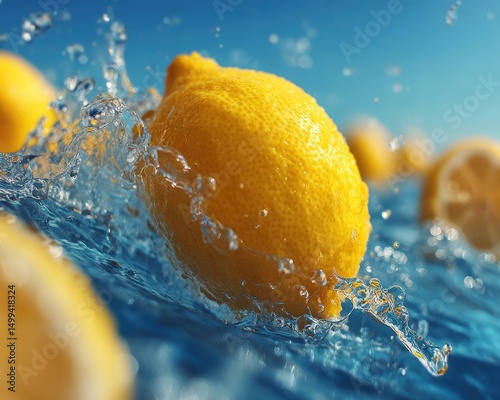 Fototapeta - Cytryny w wodzie, dynamiczne zdjęcie z efektem rozbryzgu