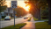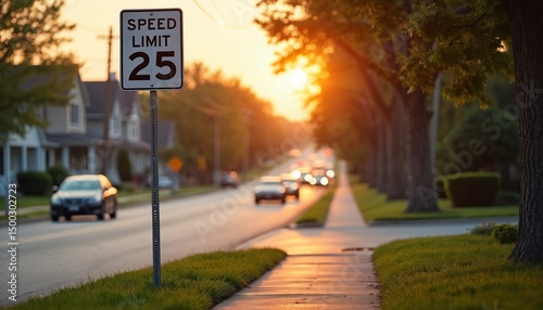 Golden hour in a quiet suburban neighborhood. Speed limit 25 mph sign on street. Cars on road, residential houses, trees, sidewalk with green grass, warm sunset daylight. Peaceful scene, safe drive.