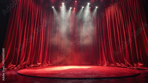 A theatrical stage with red curtains and spotlights illuminating the circular stage