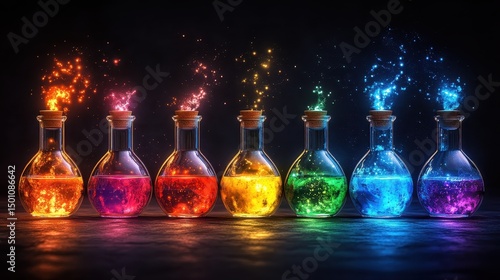 Fototapeta - Burets with colorful solutions reflecting neon lights, selective focus, modern chemistry theme, whimsical, manipulation, dynamic lab setting backdrop