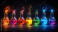 Burets with colorful solutions reflecting neon lights, selective focus, modern chemistry theme, whimsical, manipulation, dynamic lab setting backdrop