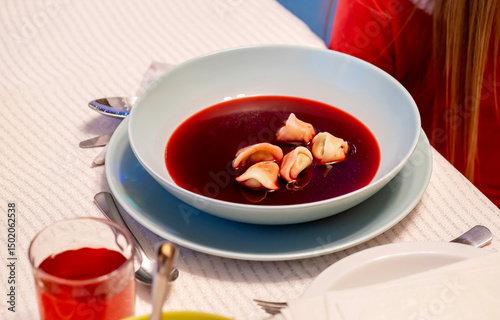 Traditional Polish red borscht beetroot soup with dumplings served, festive table, barszcz czerwony z uszkami closeup of classic Poland christmas eve dish broth ravioli homemade holiday dinner concept