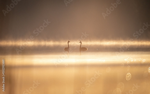 Fototapeta - Para perkozów we mgle na wodzie wschód słońca