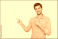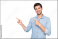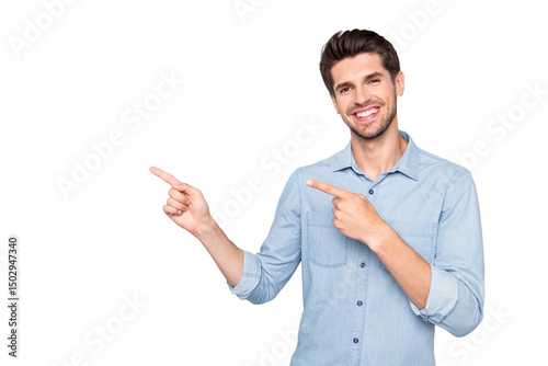 >Plakat>Portrait of positive cheerful man promoter point index finger indicate suggest promo ads wear casual style clothes isolated over grey color background