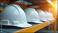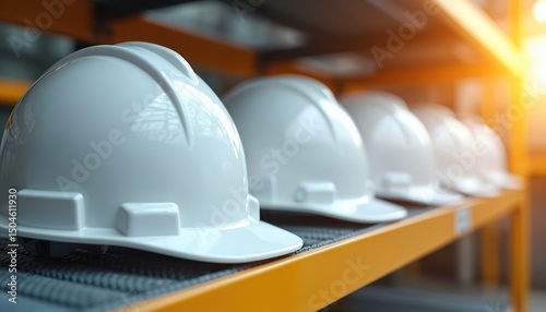 >Plakat>White hard hats arranged on metal shelf, industry workers safety. Row of protective headwear, workplace hazard prevention concept. Construction engineer equipment safety. Helmets on storage shelves,