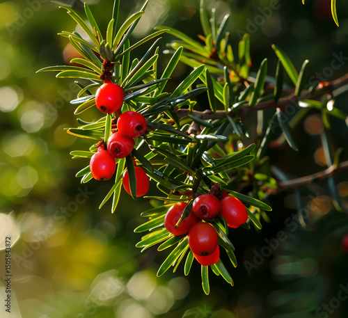 Fototapeta - Cis pospolity z czerwonymi osnówkami na tle zieleni, szczegółowe zdjęcie trującej rośliny ozdobnej w naturalnym świetle
