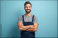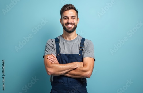 >Plakat>Cheerful repairman, craftsman portrait on blue background. Smiling, bearded handyman in work clothes. Confident construction worker, builder, positive attitude. Job, occupation, construction industry
