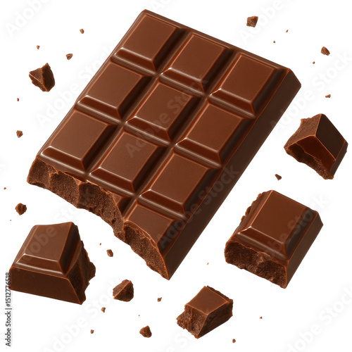 Delicious milk chocolate bar broken pieces falling isolated transparent background