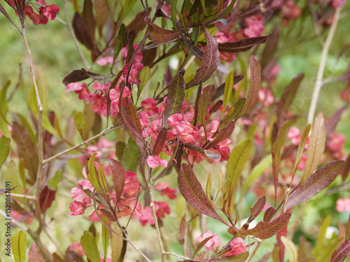 Fototapeta - Dodonaea viscosa 'Purpurea' | Broadleaf hopbush, shrub with brown-green lanceolate resinous leathery leaves with undulating margins on upright stems bearing red 3-winged samaroid fruits