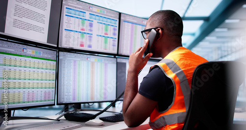 Fototapeta - Urgent Police Dispatch: Young African American Man Monitors Emergency
