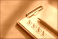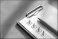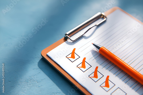 Fototapeta - Clipboard with checklist and orange pen on blue table