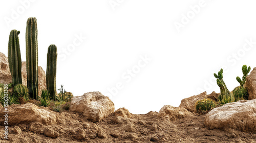 Desert landscape with cactus and rocks isolated on white background