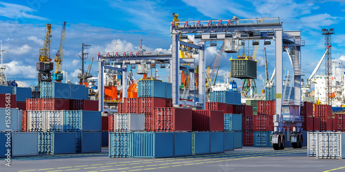 >Plakat>Container cranes and stacked cargo containers at a busy seaport terminal with ships and logistics equipment operating in global shipping. - Port. Customs. Warehouse.