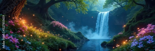 >Plakat>Luminous flowers bloom in a mystical garden, fireflies dance among glowing flora, and waterfalls cascade down moss-covered rocks A hidden, enchanted world awaits , luminous plants, fantasy