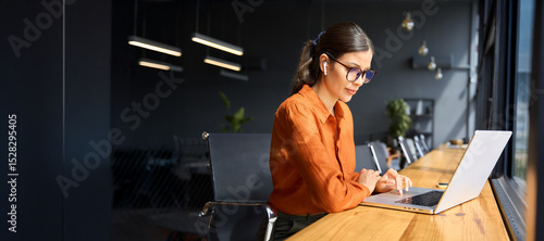 >Plakat>Latin hispanic young business woman working on laptop computer at office desk with city view. Indian entrepreneur manager businesswoman using pc for work, learning at workplace. Banner, copy space