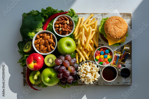 Healthy and Unhealthy Food Choices Arranged on a Rustic Wooden Board variety