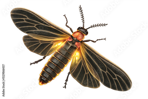 Fototapeta - Detailed digitally illustrated firefly insect with glowing abdomen and transparent wings against a stark black background.