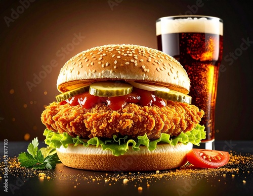 Fototapeta - Kanapka z kurczakiem w panko, piklami i ostrym sosem sriracha