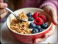 Fototapeta - Frische Beeren mit Joghurt und knusprigen Flocken in einer bunten Frühstücksschale serviert