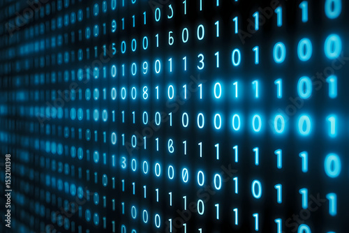 Fototapeta - Glowing blue binary code streams across a dark digital plane