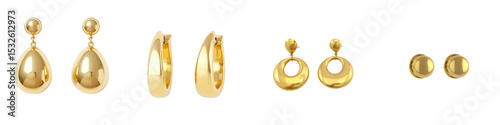 >Plakat>Gold earrings collection featuring various designs including dangling, hoop, and stud styles displayed on a transparent background for easy integration.