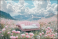 >Plakat>This surreal image features a pink sofa placed in a vibrant field filled with blooming flowers, set against a majestic mountainous backdrop, creating a dreamlike setting.